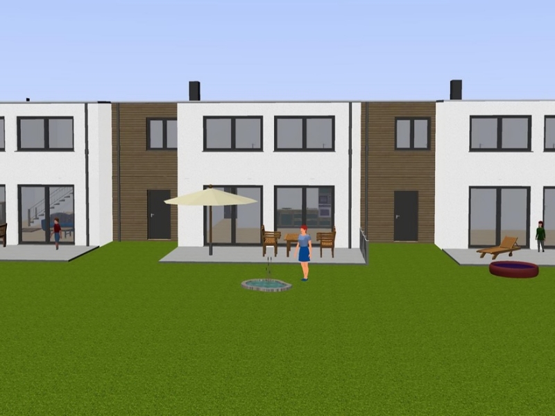 Das Konzept "Kettenhaus" erweitert das Konzept einer klassischen Reihenhaus-Siedlung um eine innovative und äußerst attraktive Variante: Die Häuser stehen nicht direkt nebeneinander, sondern sind jeweils durch eine Garage voneinander getrennt. Die Garagen wirken zwischen den einzelnen Häusern wie einzelne Glieder. Von oben betrachtet wirken die Häuser daher wie ein "Kettenhaus". So separiert haben die Bewohner mehr Ruhe und Freiraum für sich.
