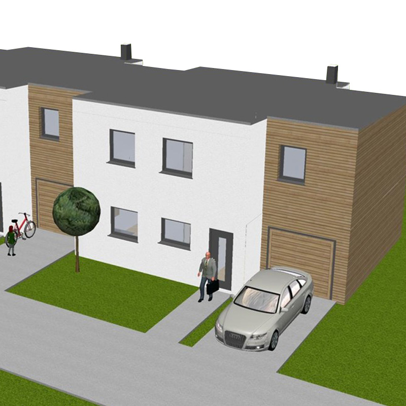 Das Konzept "Kettenhaus" erweitert das Konzept einer klassischen Reihenhaus-Siedlung um eine innovative und äußerst attraktive Variante: Die Häuser stehen nicht direkt nebeneinander, sondern sind jeweils durch eine Garage voneinander getrennt. Die Garagen wirken zwischen den einzelnen Häusern wie einzelne Glieder. Von oben betrachtet wirken die Häuser daher wie ein "Kettenhaus". So separiert haben die Bewohner mehr Ruhe und Freiraum für sich.